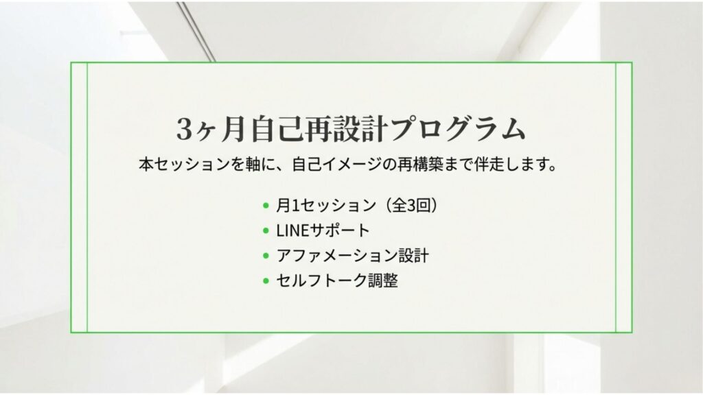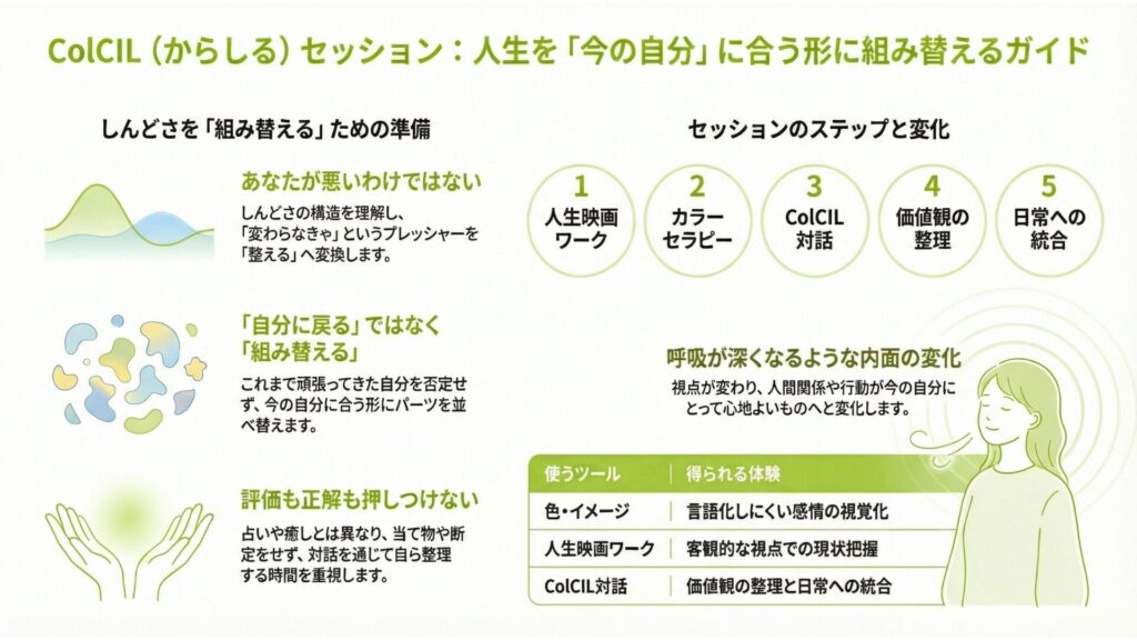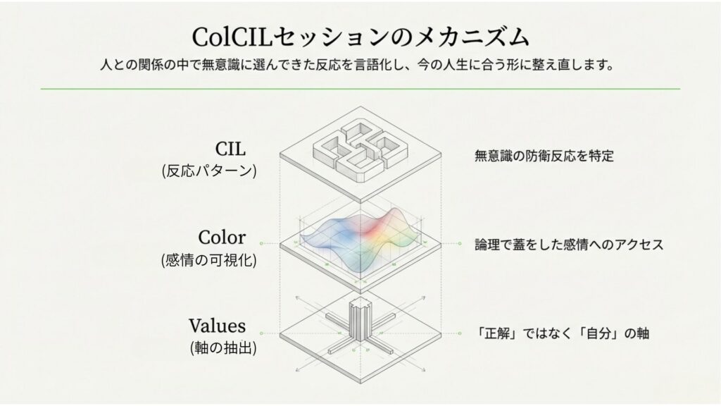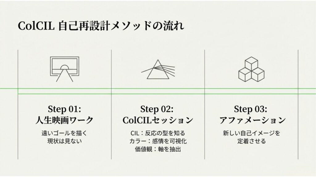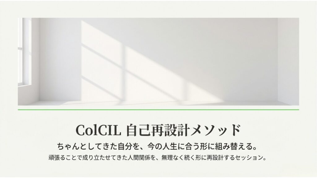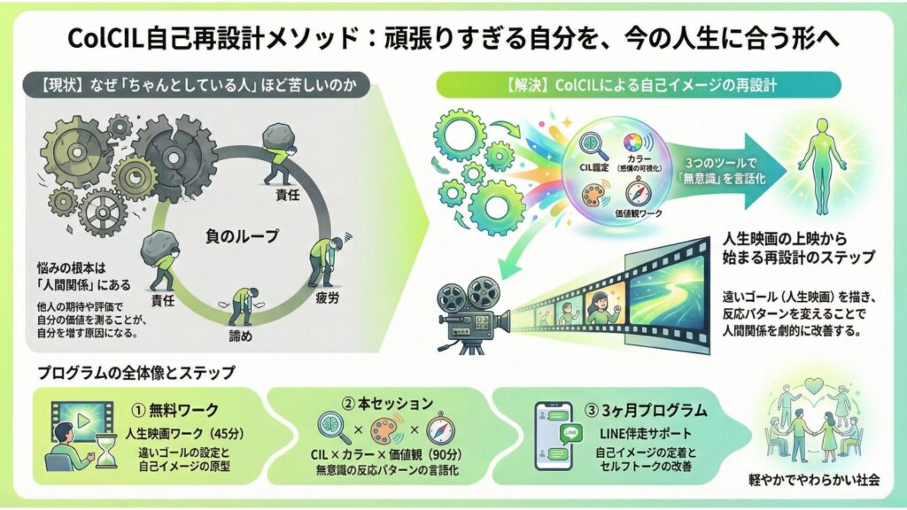 違いを前提に、人と関わる社会をつくりたい LINE コピー 2025.12.082026.02.20 そのためにColCIL自己再設計メソッドを推奨します 人生映画ワークに参加する(概念からのアプローチ) 本セッションを受ける(構造からのアプローチ)